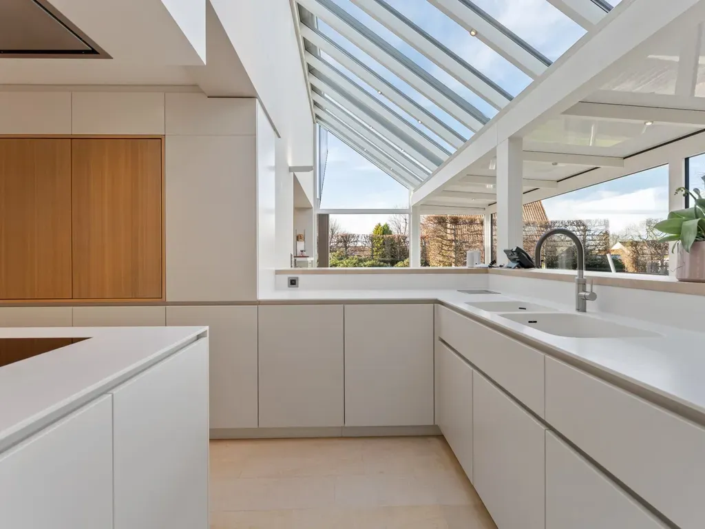 De lichtrijke keuken is ingericht met een zithoek en kijkt uit op zowel de tuin als het zwembad. Ze is volledig uitgerust en afgewerkt met een Corian werkblad, inductiekookplaat, stoomoven en kwalitatieve inbouwtoestellen. De tweede, afzonderlijke leefruimte leent zich perfect als tv-kamer, salon of rustige ontspanningsruimte.