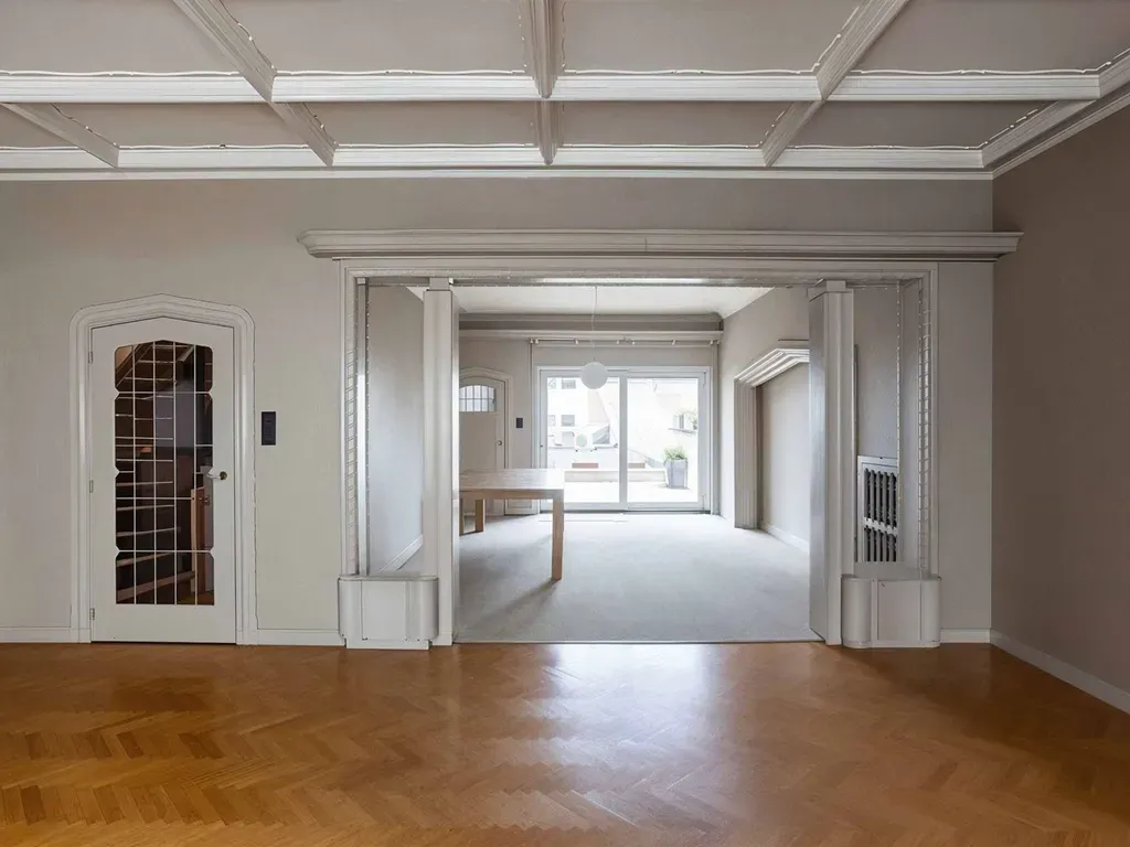 De lichtrijke leefruimte met prachtig parket én authentieke elementen straalt een warme, uitnodigende sfeer uit. Aansluitend opent de eetplaats zich naar het zonnige terras.