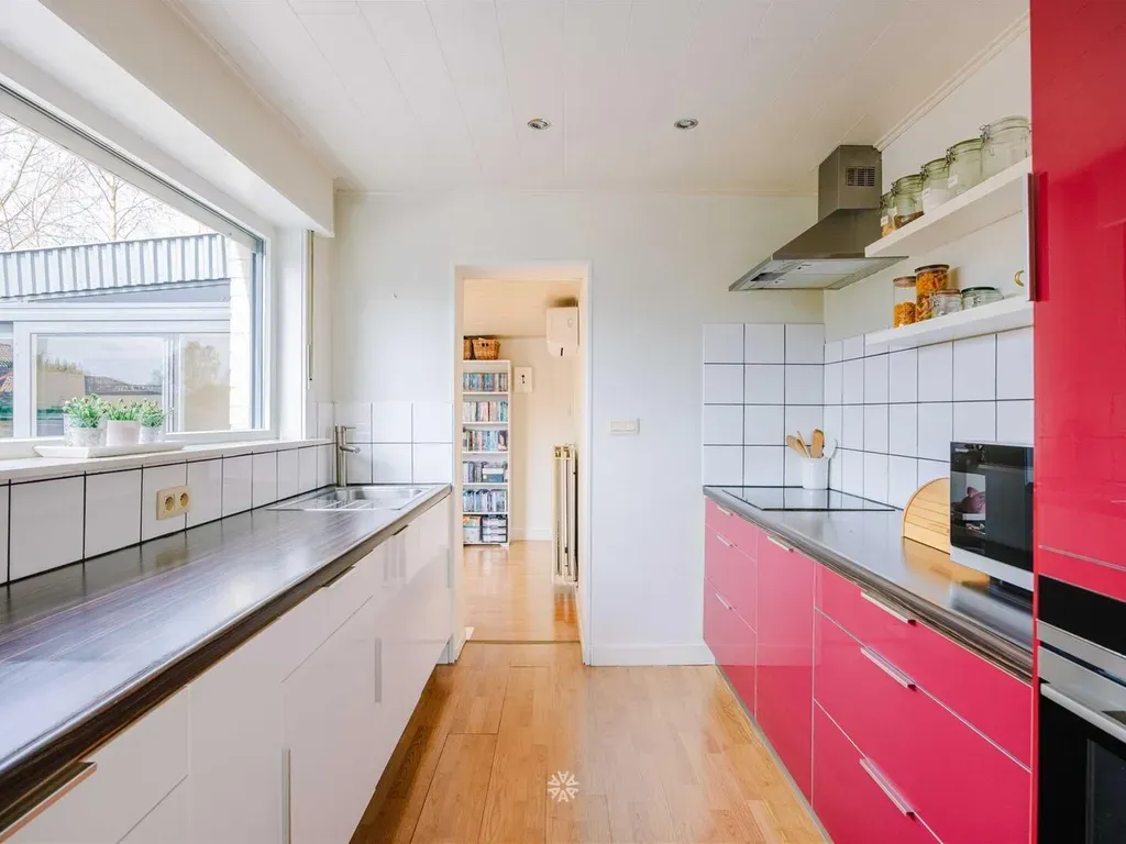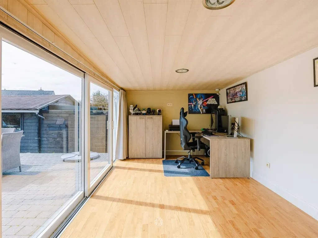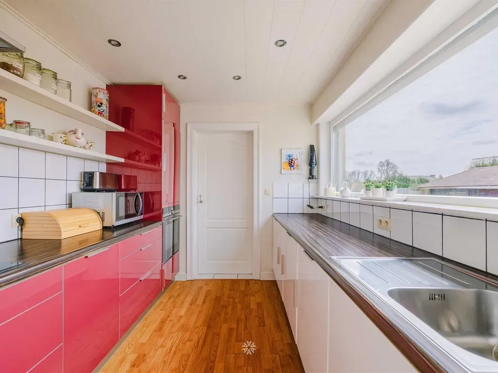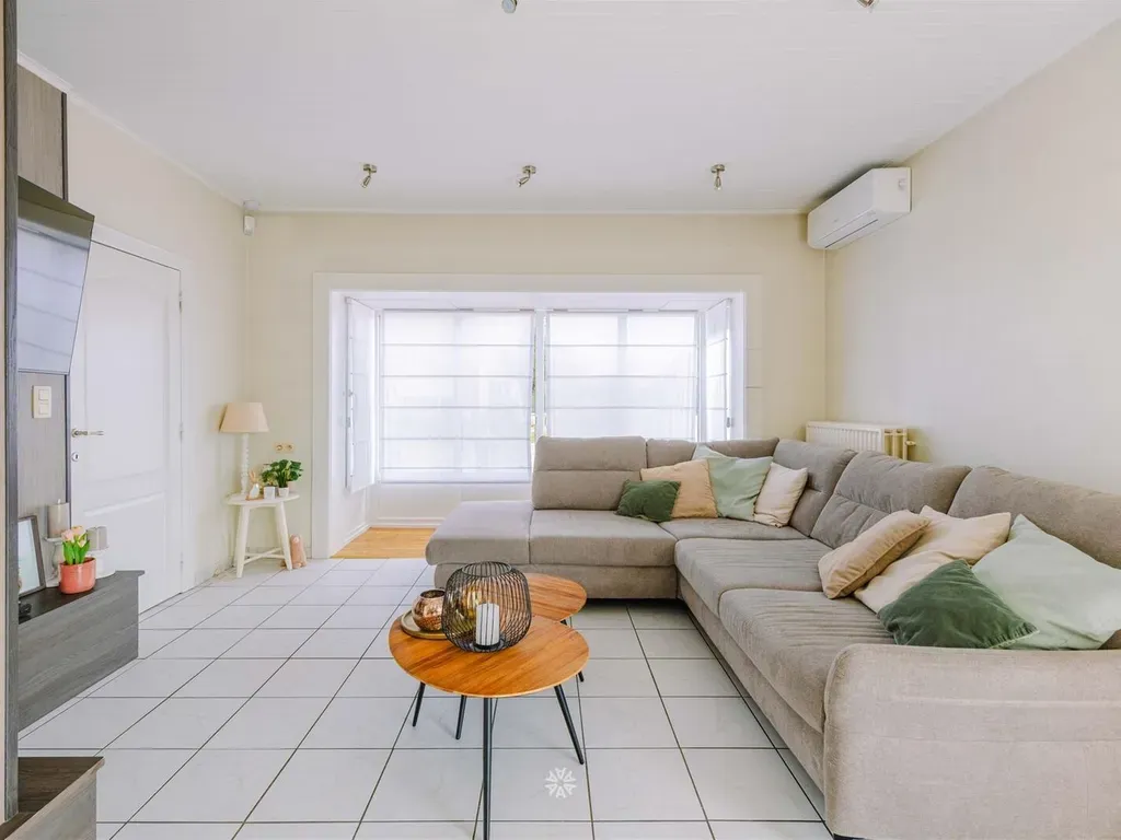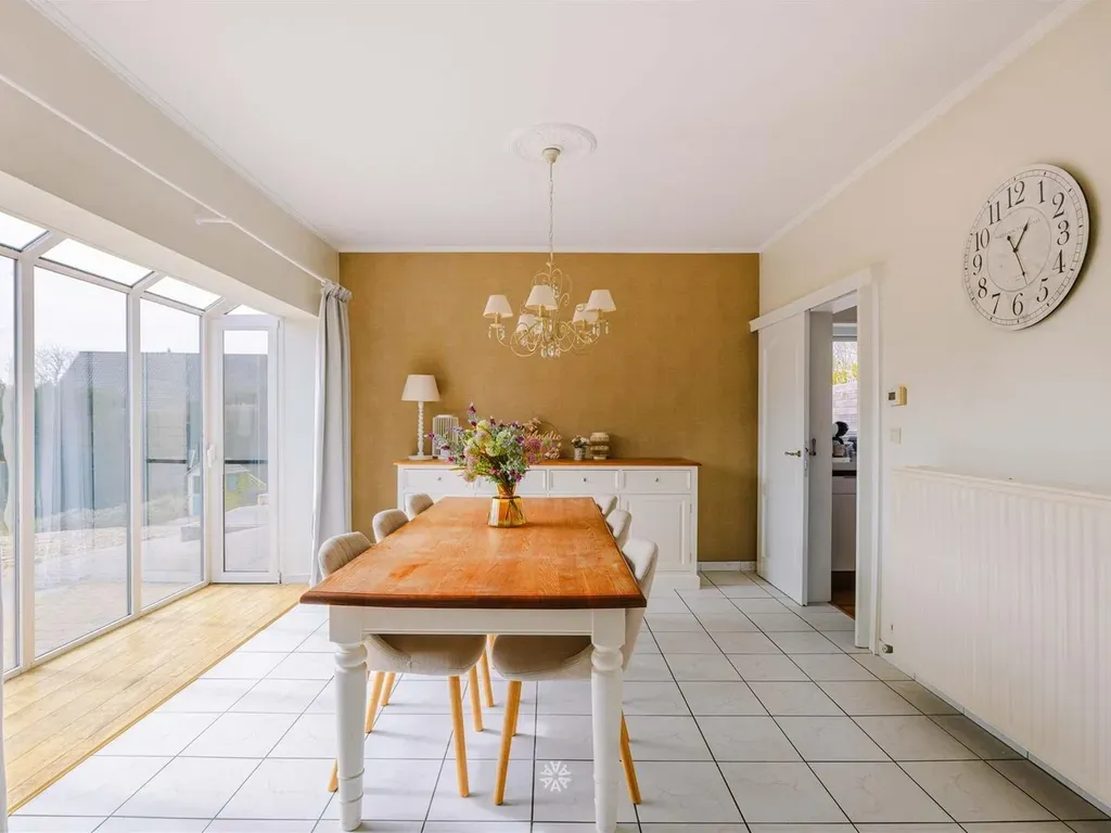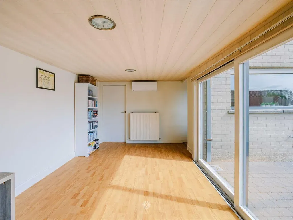 De inkomhal met gastentoilet en vestiaire geeft toegang tot de ruime leefruimte met zeer veel lichtinval dankzij de erker aan zowel de voorkant bij de zitruimte als de zijkant bij de eetplaats. Vanuit de eetplaats is er bovendien volledig zicht en connectie met de Zuid-gerichte tuin. De keuken voorzien van alle comfort en de veranda die nu als bureauruimte wordt gebruikt.