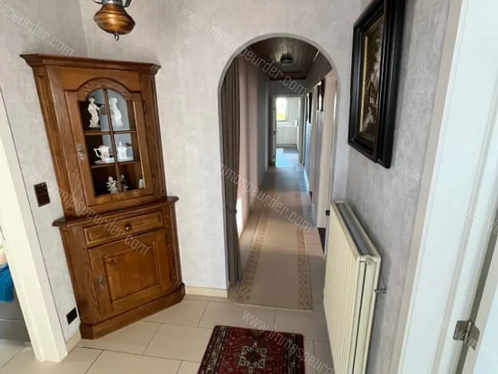 Rondgang volgens de foto's; Via de voordeur komen we in de centraal gelegen gang die uitkomt op de keuken achteraan het huis. Vanuit de keuken kunnen we naar de berging, het overdekte terras aan de rechterzijde als ook naar de eetkamer. De eetkamer en living vormen één groot open geheel met haard, radio aansluitingen voor ingebouwde speakers en gemetst tv-meubel. Vanuit de living komen we terug in de inkomhal. Aan de overzijde van de inkomhal vinden we de grootste slaapkamer met elektrisch rolluik. via de gang vinden we nog 2 gelijkaardige kamers die gebruikt kunnen worden als slaapkamer, hobbykamer, ... etc beide met een ingemaakte kast van 2m breed en 0,6m diep over de volledige hoogte. Vervolgens komen we via de gang in de badkamer met aangrenzende aparte toiletruimte. In de gang bevindt zich ook een zoldertrap. Via berging komen we in de kelder