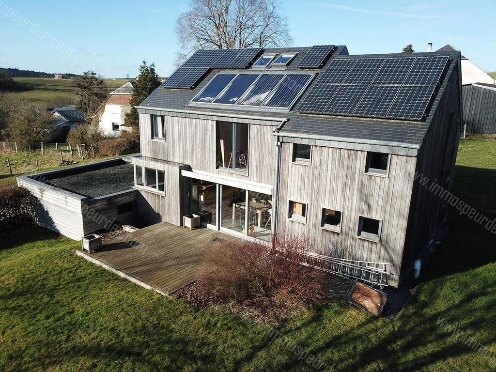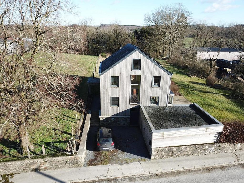 Menugoutte 2 - 6887 Herbeumont - SOUS COMPROMIS DE VENTE - Belle maison en ossature bois, entièrement autonome, jouissant d'un grand jardin et d'une belle terrasse tous deux idéalement orientés plein sud. Elle offre au rez-de-chaussée : un hall d'entrée, un vestiaire, un WC séparé, une cuisine ouverte sur une grande salle à manger très lumineuse avec de belles grandes baies vitrées, un coin salon très intime et chaleureux avec poêle hydraulique et espace bureau séparé.