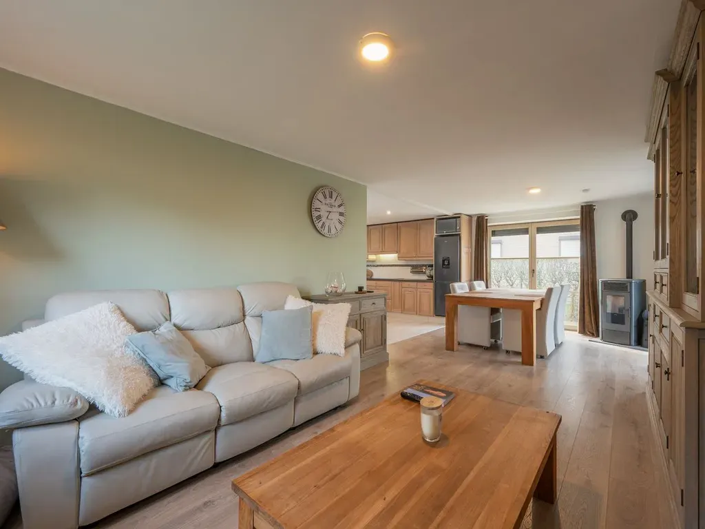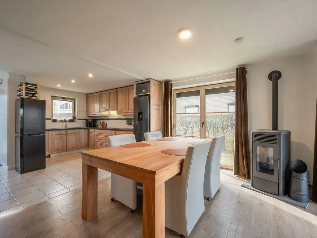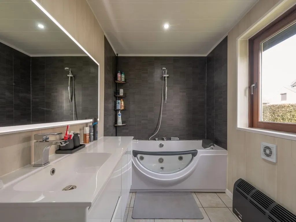 Bij het binnenkomen geniet u meteen van een open en aangenaam zicht op de keuken en de leefruimte, wat zorgt voor een ruimtelijk gevoel en een vlotte verbinding tussen beide. Aansluitend bevinden zich een praktische berging en de badkamer met bubbelbad en wasplek beide handig gelegen op het gelijkvloers.
