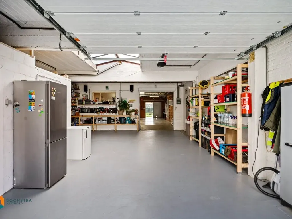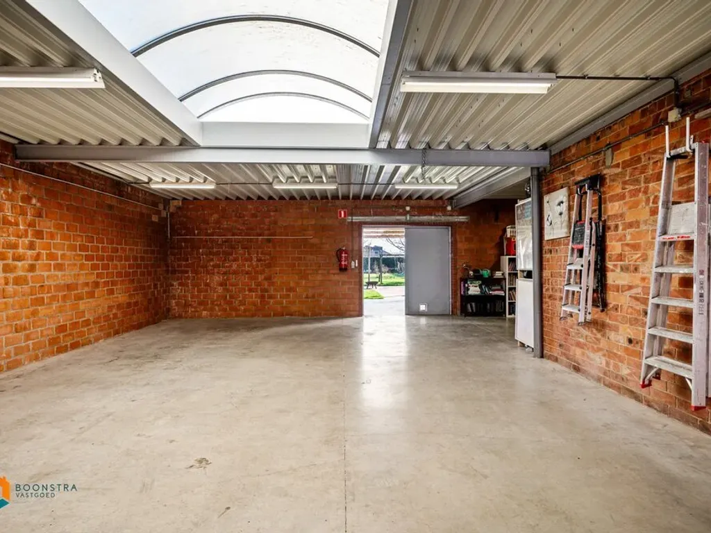 Aansluitend aan de woning vinden we het magazijn/loods van maar liefst 300m², volledig vergund en uitstekend toegankelijk. Deze polyvalente ruimte is voorzien van twee sectionaalpoorten, wat zorgt voor een vlotte in- en uitrit, ook voor grotere voertuigen. Dankzij de royale oppervlakte en praktische indeling leent het magazijn zich perfect voor diverse doeleinden zoals opslag, atelier, werkplaats of het stallen van materiaal, voertuigen of machines. Bovendien beschikt het magazijn over een extra douche, toilet en een praktische wasruimte, wat het comfort en de functionaliteit aanzienlijk verhoogt. De loods biedt daarnaast voldoende hoogte en bewegingsruimte. De directe aansluiting met de woning vormt een extra troef voor wie wonen en werken wil combineren op één locatie.
