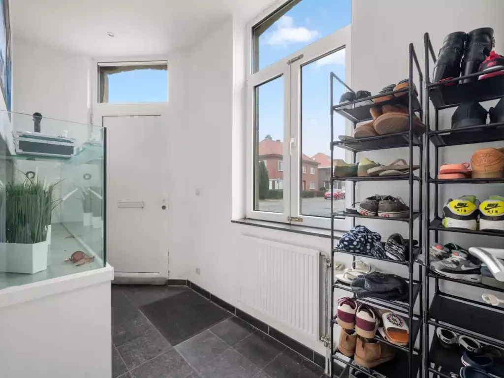 U betreedt de woning via de lichtrijke inkomhal die toegang biedt tot de ruime leefruimte met een gezellige ingebouwde haard. Aansluitend bevindt zich de de uitgeruste keuken met oven, vaatwasser, gasvuur met dampkap en dubbele spoelbak. Naast de keuken is er een aparte opbergruimte, ideaal voor de opslag van voorraad en huishoudelijke spullen. Verder beschikt de woning over een praktische berging met wateraansluiting voor de wasmachine en een extra douche.