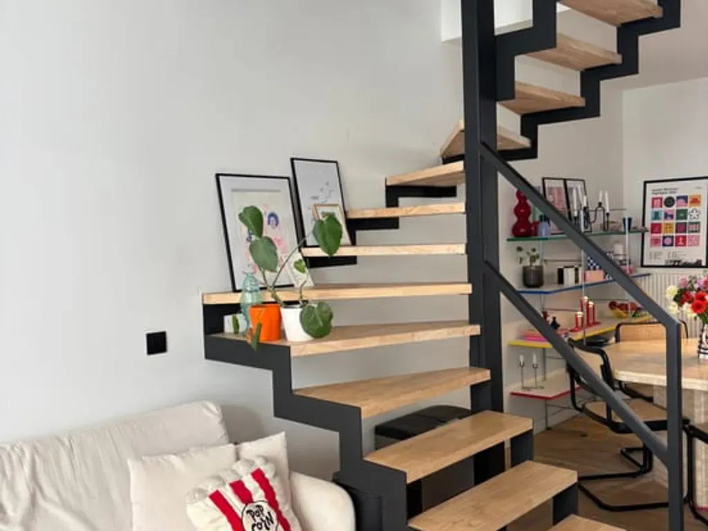 Je komt binnen via een lichtrijke hal met een stalen deur die meteen wat extra ruimtegevoel geeft. Van daaruit stroom je de leefruimte in, praktisch ingedeeld met een open keuken, eetruimte en gezellige living. Aan de achterkant is er een terras met een handige buitenkast voor je afvalcontainers, zodat alles netjes weggewerkt blijft. Een mooie stalen trap scheidt de ruimtes en geeft het geheel meteen wat karakter. De keuken is volledig uitgerust met vaatwas, oven, frigo & microgolfoven. Koken wordt zo een plezier, met alles wat je nodig hebt binnen handbereik.