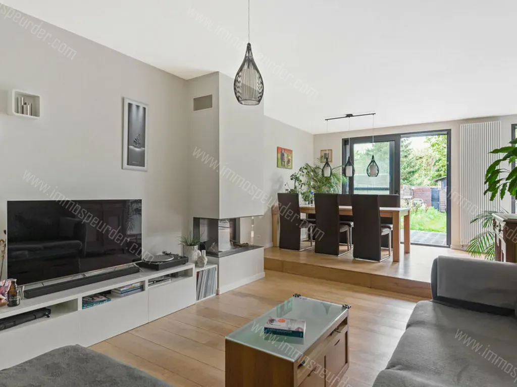 De living met open ingerichte keuken heeft zicht op de aangelegde tuin met terras, afzonderlijke zij-ingang en tuinhuis.