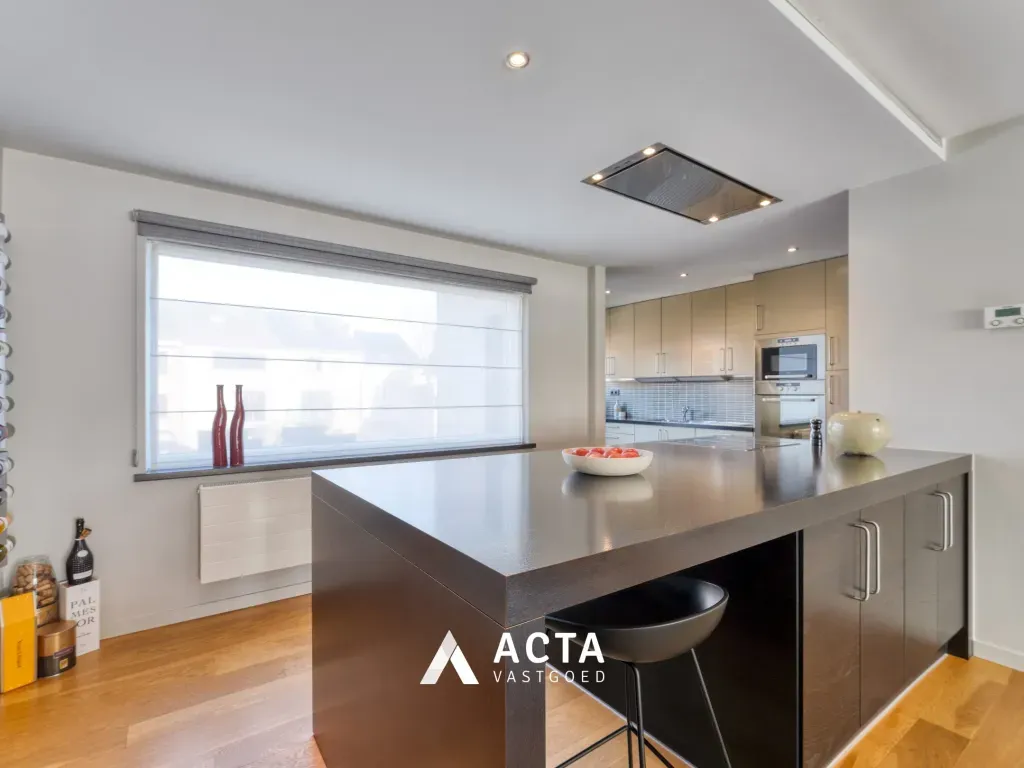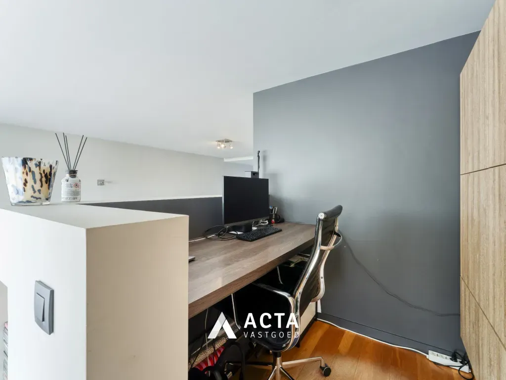 Op de eerste verdieping bevindt zich de lichtrijke woonkamer met parketvloer. Naast de zithoek werd een extra bureauruimte gecreëerd, eveneens voorzien van ingemaakte kasten. De ruime open keuken sluit naadloos aan bij de leefruimte en is uitgerust met een kookeiland met keramische kookplaat en dampkap, oven, microgolfoven, koelkast, dubbele spoelbak en tal van opbergkasten. Via de keuken heeft u toegang tot een zonnig terras, ideaal om 's morgens te ontbijten. Op deze verdieping bevindt zich tevens een afzonderlijk toilet.