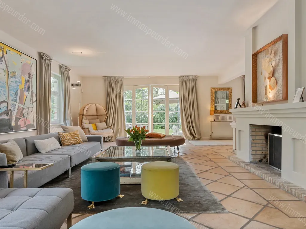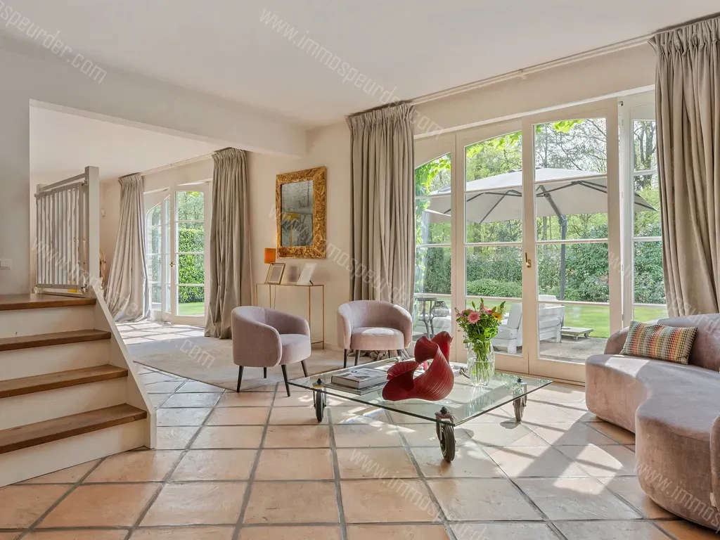 Meteen bij binnenkomst is er een open zicht tot in de tuin. De sfeervolle inkomhal is open tot in de nok en biedt plaats aan het gastentoilet en een vestiaire. De leefruimtes staan allen met elkaar is verbinding en hebben allemaal een prachtig zicht op het groen. De woonkamer geniet langs 3 zijden van natuurlijk daglicht, heeft een gezellige open haard en biedt ruimte aan meerdere zithoeken. Via de dubbele openslaande deuren, stapt u zo het terras op. De leefkeuken is bijzonder ruim en biedt makkelijk plaats aan een eettafel voor 8 of 10 personen. Deze is voorzien van kwaliteitstoestellen zoals een gasfornuis van Boretti, granieten werkblad met ingewerkte spoelbak en afgewerkt met bijzonder veel kasten en Hollandse witjes. Aansluitend aan de keuken heeft u een handige berging / wasplaats met ingemaakte kasten en zij-ingang. Via een sfeervolle bibliotheekruimte met stalen deuren en maatkasten bereikt u de riante eetkamer, met daar maar liefst 5 dubbele, openslaande deuren naar de tuin.