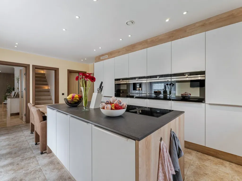 Voorts bevindt zich de woonkamer met vooraan zicht op de weilanden en veel lichtinval. Van hieruit kan u de moderne keuken betreden die volledig is ingericht met Siemens/Miele toestellen (oven, microgolf, koffietoestel, stoomoven, vaatwasmachine, koelkast, diepvriezer, inductievuur). Deze is ook ingericht met veel opbergkasten en ruim kookeiland. Naast de keuken vindt u een extra bergruimte terug met toegang naar de kelder. Verder bevinden er zich op de gelijkvloerse verdieping een extra slaapkamer, alsook de zeer praktische badkamer. De badkamer is volledig betegeld en geïnstalleerd met inloopdouche, ligbad, toilet en dubbele lavabo.