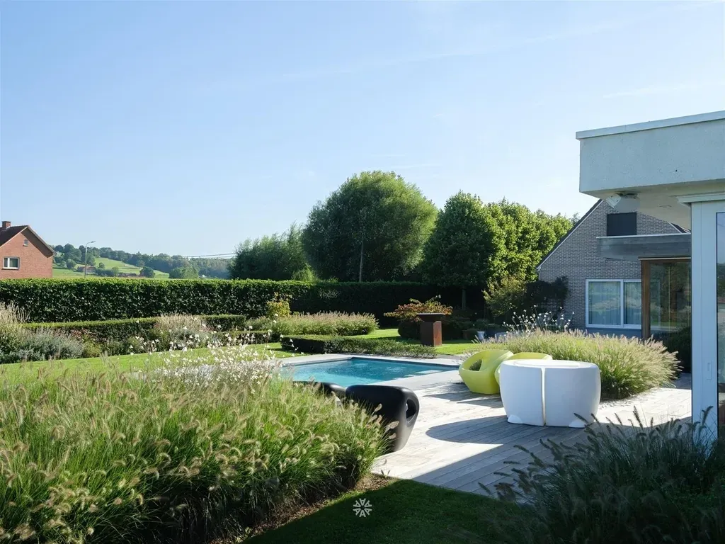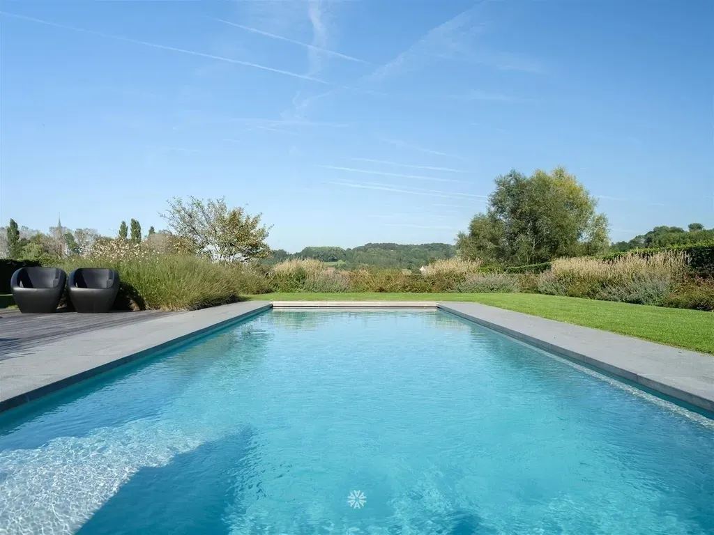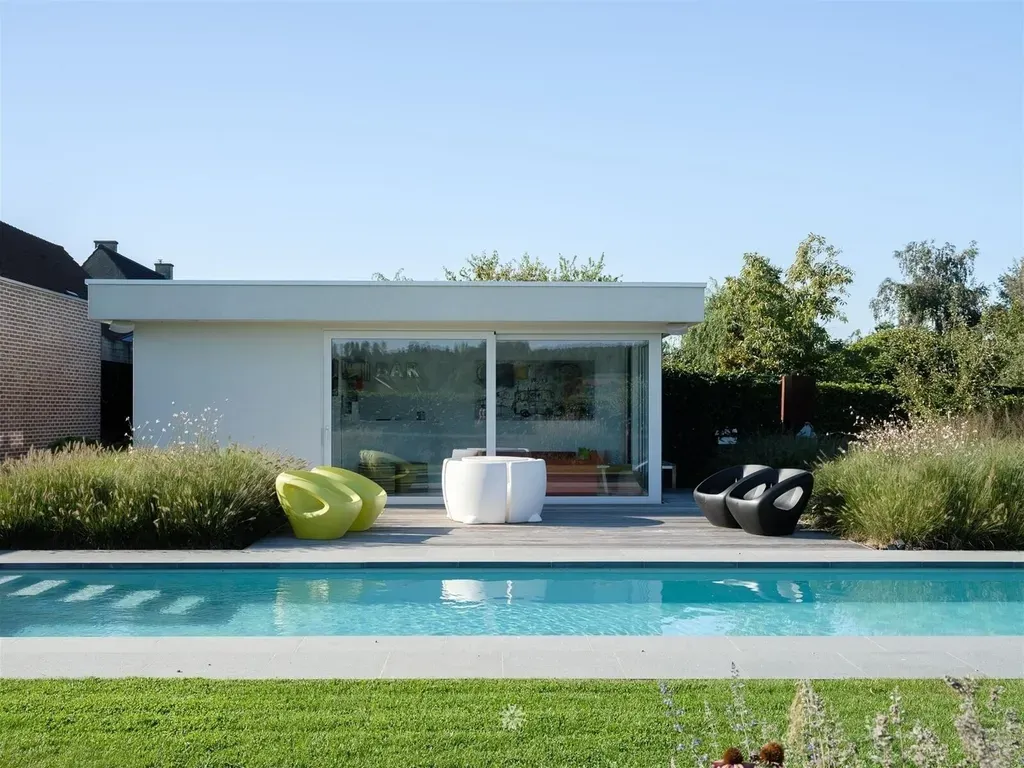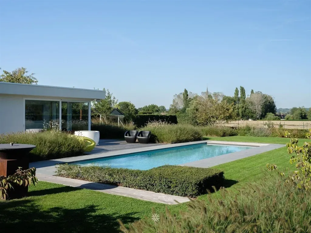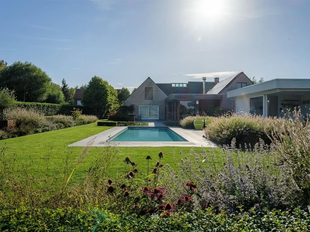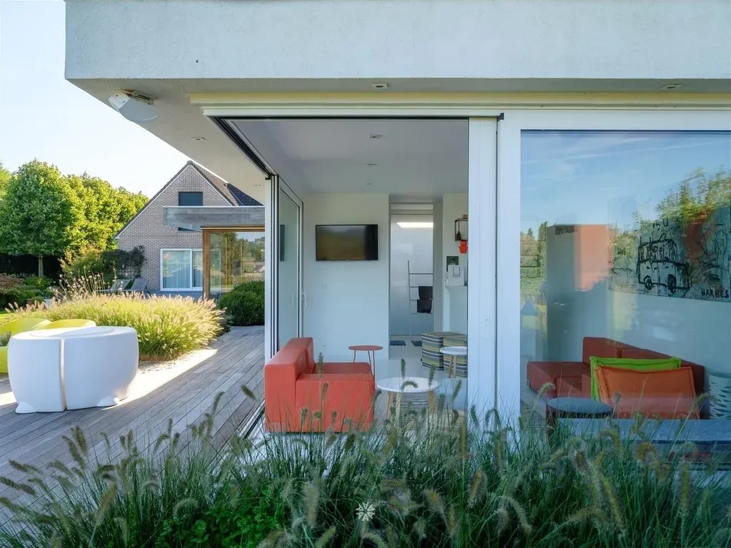 Terrassen met zonnetent, zwembad (12x3,5m), poolhouse (30m²) in strakke stijl voorzien van douche, wc, TV en bar. Verder de volledig aangelegde tuin, moestuin en serre. 2 extra buitenautostaanplaatsen.