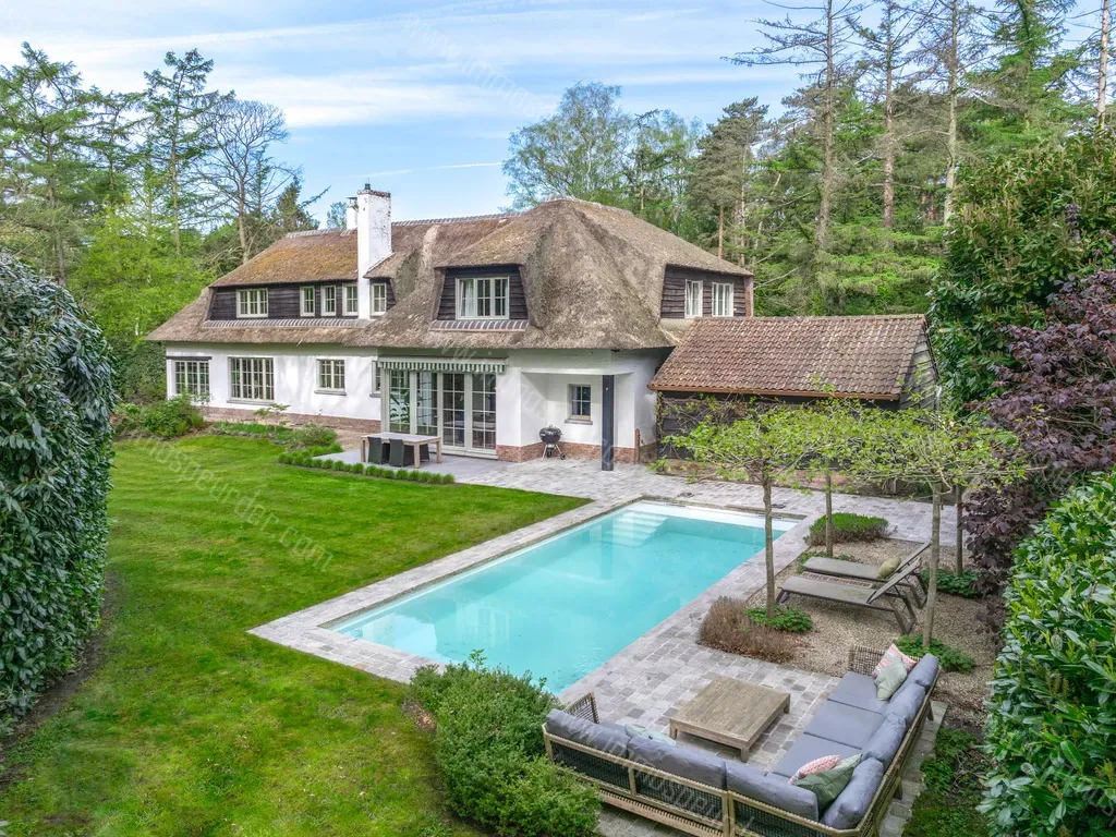 Rozenlaan 3 - 2970 Schilde - Langs de lange en uiterst rustige Rozenlaan, een van de mooiste in de villawijk Hof ter Linde en makkelijk bereikbaar voor het dorp, bereikt u deze charmante rietgedekte villa, badend in het groen en licht.