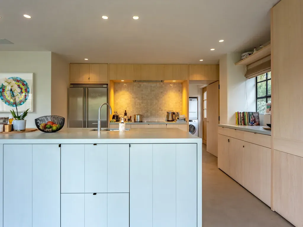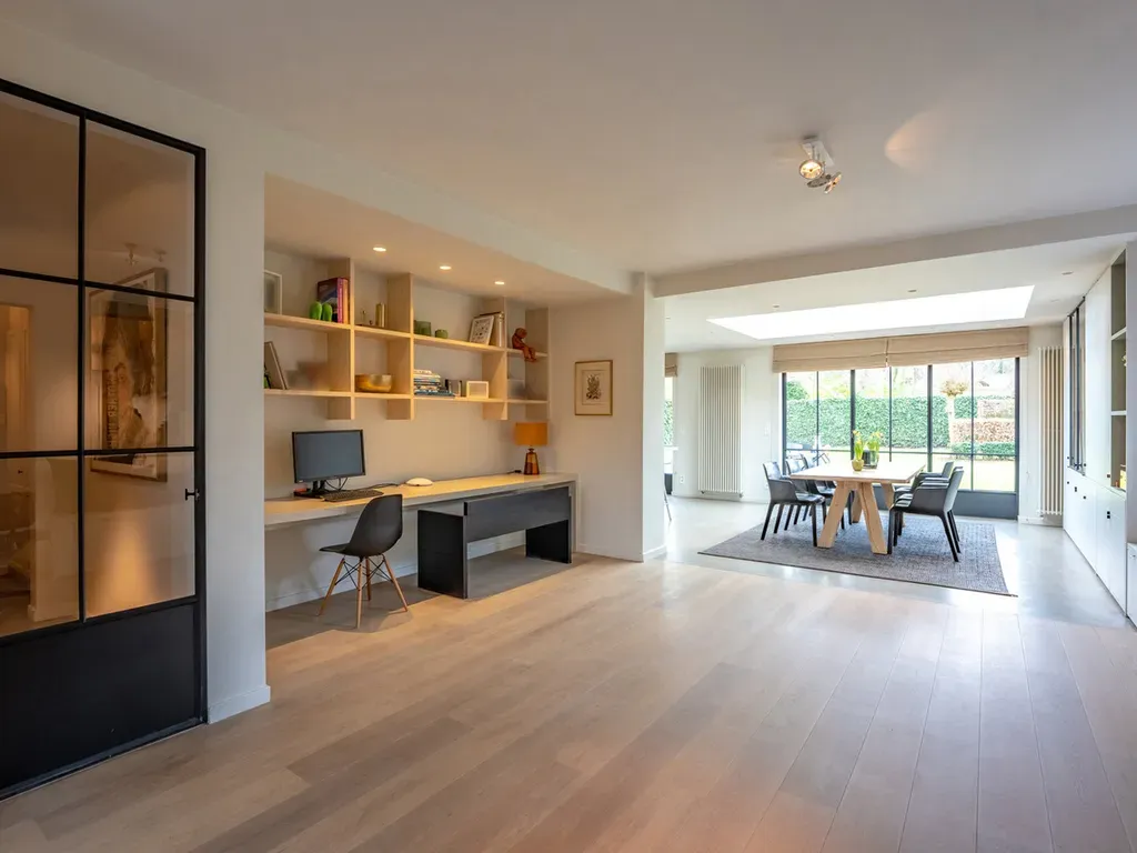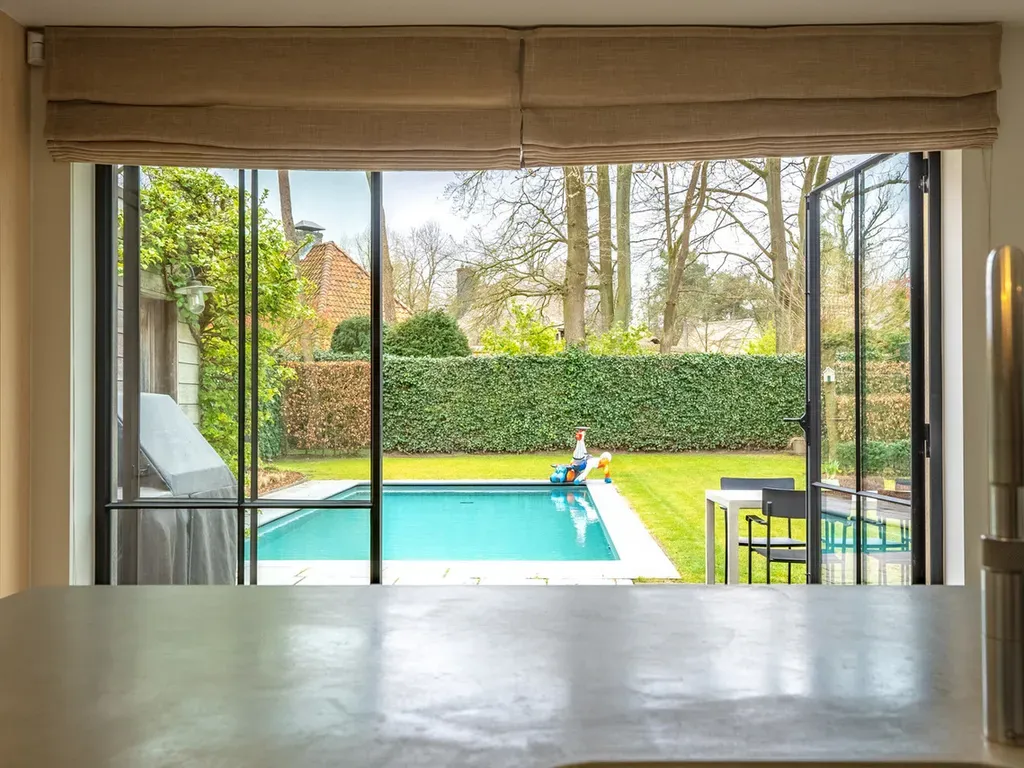 gelijkvloers: inkomhal met vestiaire, aparte bureelruimte (10m²), apart gastoilet, ruime doorlopende leefruimte voorzien van maatkasten en houthaard (56m²) , een royale keuken (26m²) voorzien van alle toestellen met zicht op de tuin en het verwarmd zwembad. Middels de dubbele smeedijzeren deuren (zowel langsheen de eetkamer en keuken) heeft u zicht en toegang tot de volwassen tuin en terras. De wasruimte en garage zijn toegankelijk vanuit de keuken d.m.v. "blinde deuren". gans het gelijkvloers is voorzien van mortex- of parket vloer.