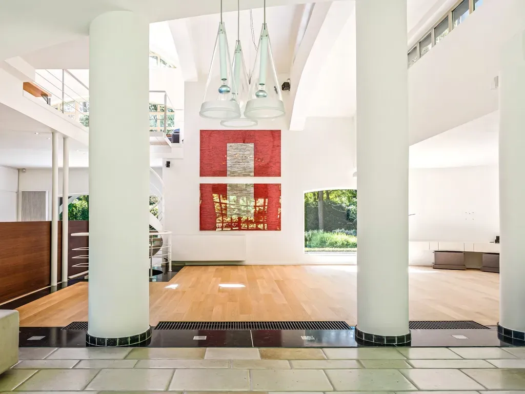 We betreden de woning via een ruime inkomhal met gastentoilet en vestiaire. Deze centrale hal geeft enerzijds uit op de riante en lichtrijke woonkamer met indrukwekkende vide. Hier vinden we verschillende zitruimtes en een eetkamer. De mezzanine wordt momenteel gebruikt als een fantastische home office met een leuk contact met de woonkamer en eigen zonnig terras.