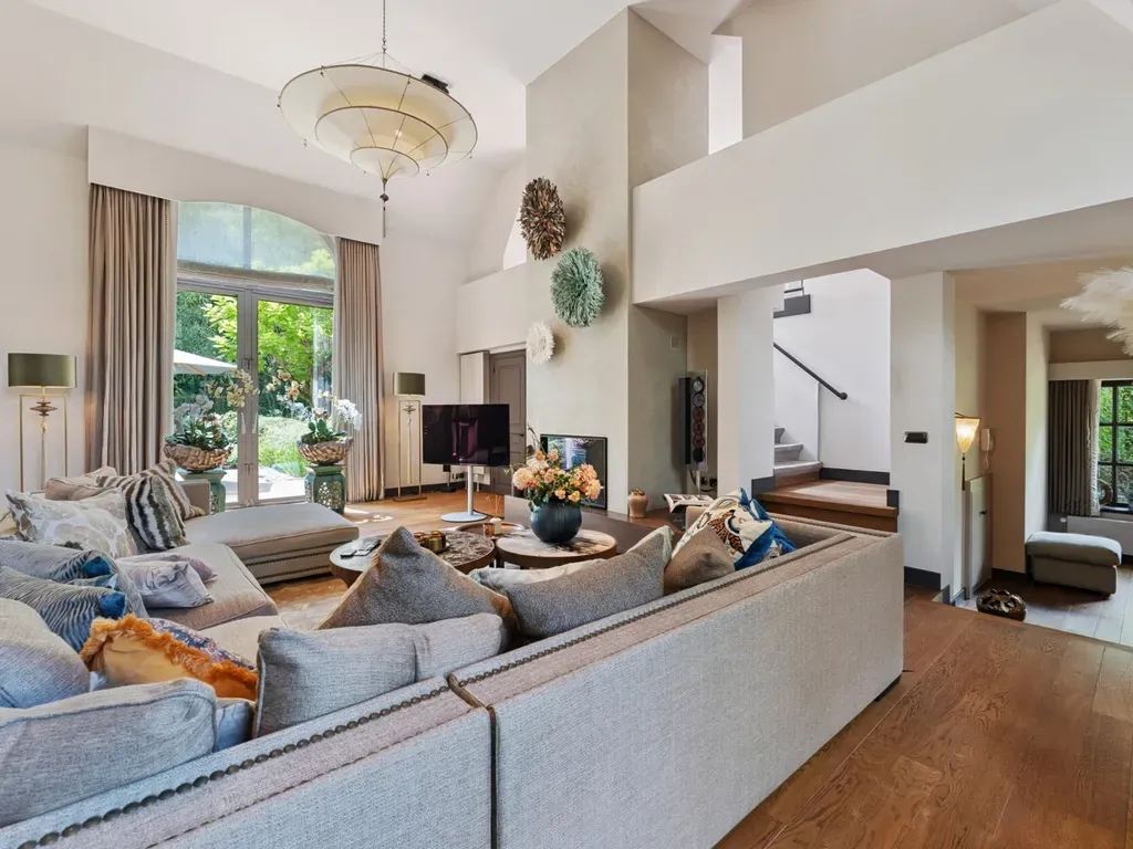 De riante leefruimte met imposante plafondhoogte baadt in het licht dankzij grote raampartijen en biedt directe toegang tot het zonnige terras en de tuin. De luxueuze zithoek met open haard vormt het hart van de woning en nodigt uit tot ontspanning. Aansluitend vindt u een aparte leeshoek, perfect ingericht met op maat gemaakte kasten en stijlvolle accenten.