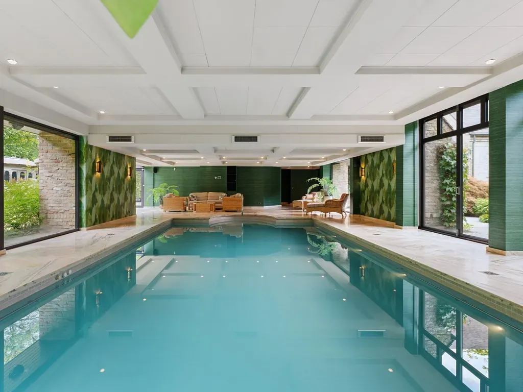 Een absolute troef is het prachtige binnenzwembad en jacuzzi met zicht op het omliggende groen, perfect geïntegreerd in de woning en voorzien van een luxueuze ontspanningsruimte met bar en sanitaire voorzieningen. Samen met de hamam beleef je hier een echte private wellnesservaring.