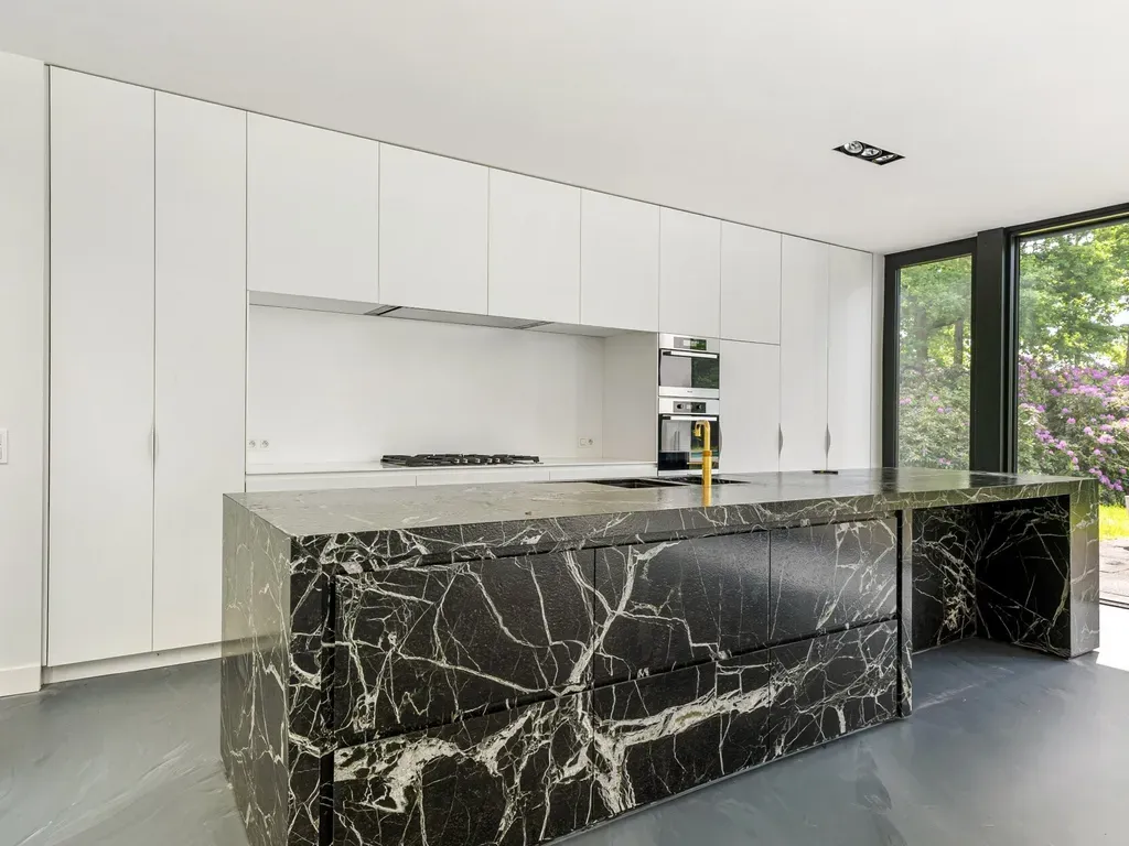 Aansluitend de leefruimte treffen we de zeer royale leefkeuken met volledig geïnstalleerd eiland.