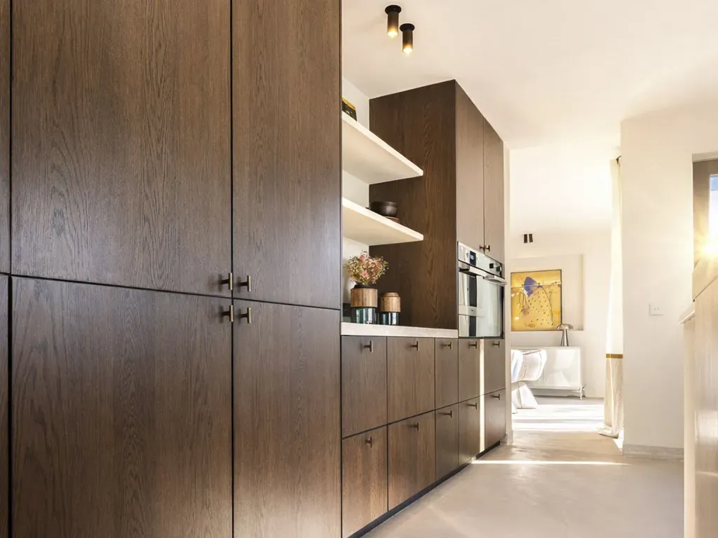 De naadloos geïntegreerde vlakke deuren en stijlvolle stalen binnendeuren versterken het charmante karakter, terwijl de exclusieve maatkeuken uitblinkt met een koelcel en hoogwaardige Miele-toestellen.
