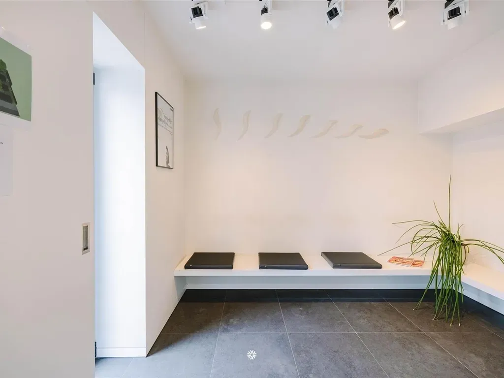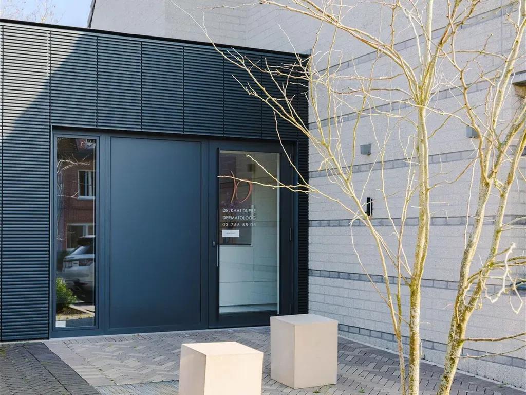 De praktijkruimte omvat een aparte inkom, wachtplaats, bureau, toilet en drie kabinetten/kantoorruimtes. Alles samen goed voor een nuttige oppervlakte van ongeveer 100 m².