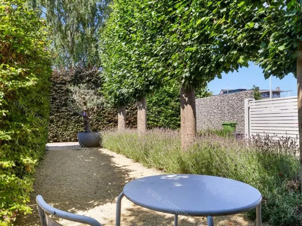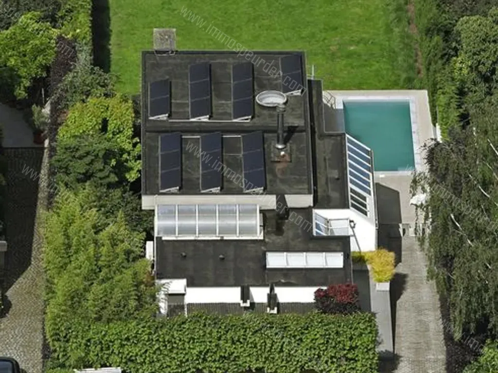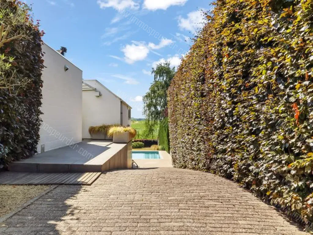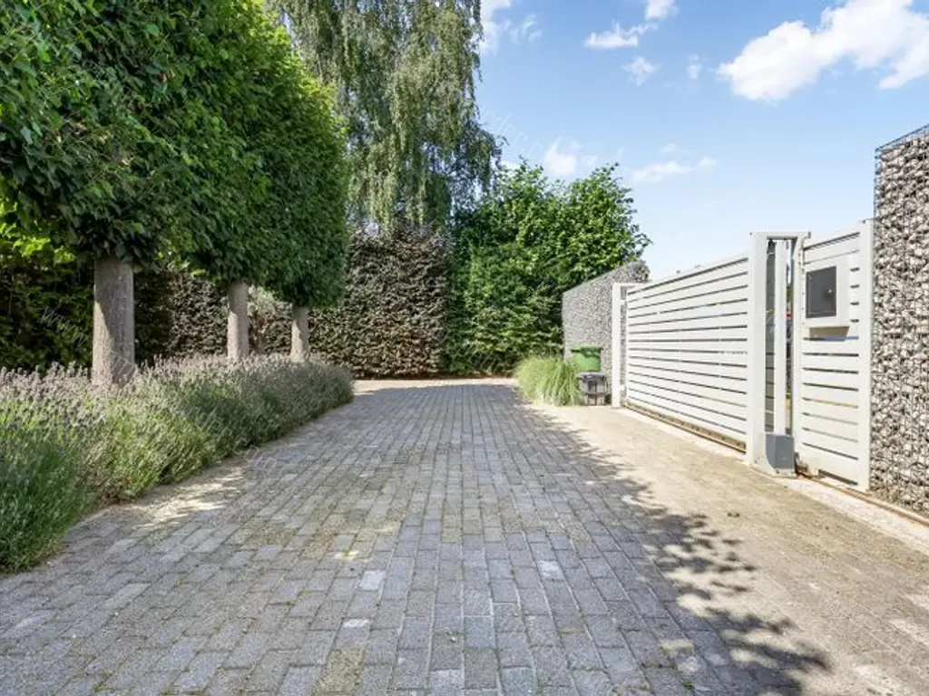 Achter de poort die het pand aan het zicht onttrekt zijn er twee parkeerplaatsen. De lichtrijke entree leidt via glazen deuren naar de riante living met hoge plafonds, houten vloer en inbouwhaard. Het infinity-zicht op de velden via de glaspartijen en ligging op het 1e verdiep aan de achterzijde, wordt versterkt door het terras (40m²) dat binnen en buiten naadloos verenigt. De relaxruimte aan de andere zijde baadt in licht en groen, net zoals de aansluitende keuken met hoogwaardige inbouwapparatuur. De master bedroom op het gelijkvloers is verbonden met een luxueuze en-suite badkamer met lichtstraat, dubbele wastafel, bad en inloopdouche. De twee andere ruime slaapkamers en 2e badkamer met toilet, dubbele wastafel en douche liggen op het lager verdiep. De west-gerichte grote tuin met verwarmd zwembad kijkt uit over de glooiende velden en geeft toegang tot een toilet, een ruime garage en een polyvalente ruimte (bureau, atelier ...) met grote glaspartij.