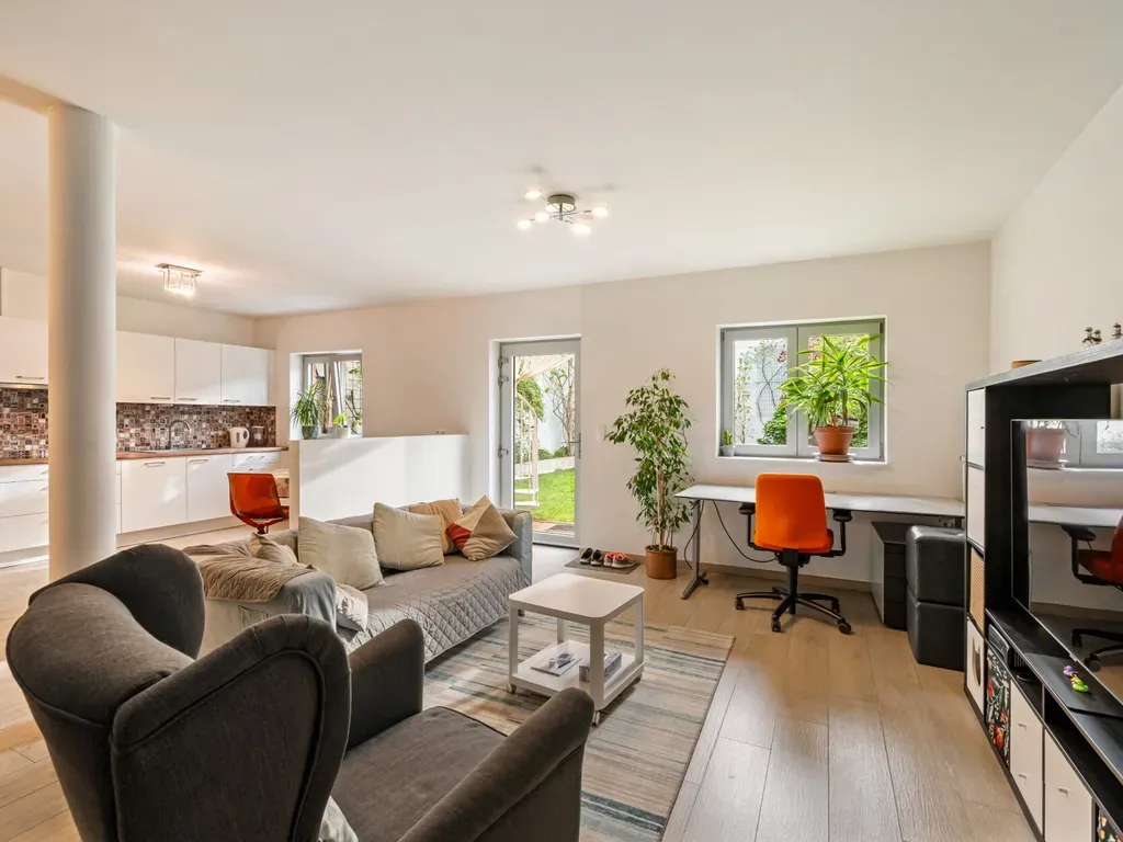 Op het gelijkvloers bevindt zich een ruime inkomhal met vestiaire, een grote inpandige garage met hoge sectionale poort en achteraan een volledig uitgeruste studio. Deze bestaat uit een keuken, badkamer met toilet en inloopdouche, een leefruimte, berging en een slaapkamer. Vanuit de leefruimte heeft u toegang tot de gezellige tuin.