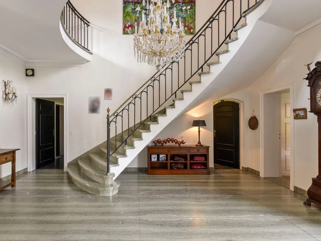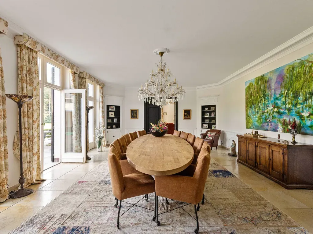 De lange oprijlaan vanaf de straatzijde brengt u naar de hoofdvilla, dewelke centraal is gesitueerd op het eigendom. We betreden dit landhuis via de centrale inkomhal op Portugese marmer dewelke links voorzien is van een vestiaire met gastentoilet en anderzijds uitgeeft op de majestueuze trappenhal. Rechts van de inkomhal betreden we de woonkamer georiënteerd op het zuiden dewelke heel de dag van veel natuurlijke lichtinval geniet. De grote eetkamer met uitzicht over het park en de vijver is bereikbaar via de woonkamer en de trappenhal.