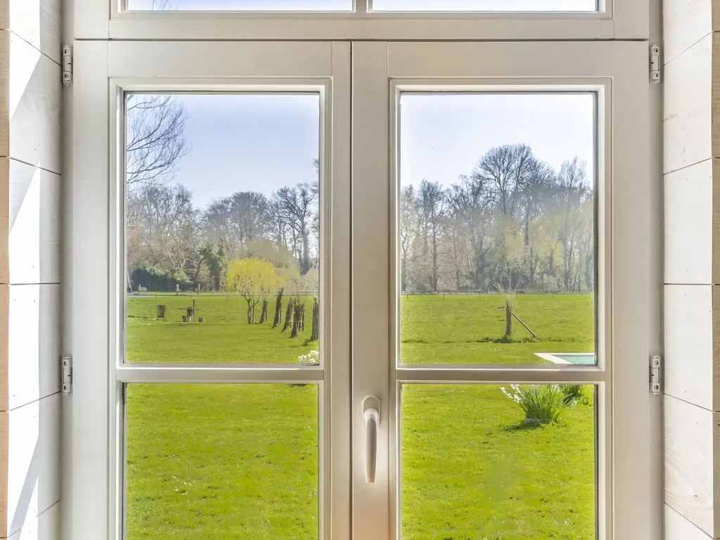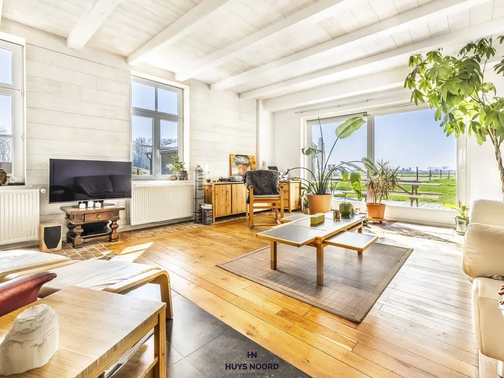 De grote raampartijen bieden een uniek zicht over de aangelegde tuin, weides en Sint-Annapolder.