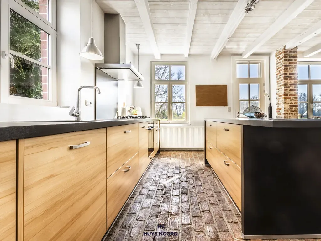 Hyper-geïnstalleerde open keuken met aansluitend de woon- en eetkamer.