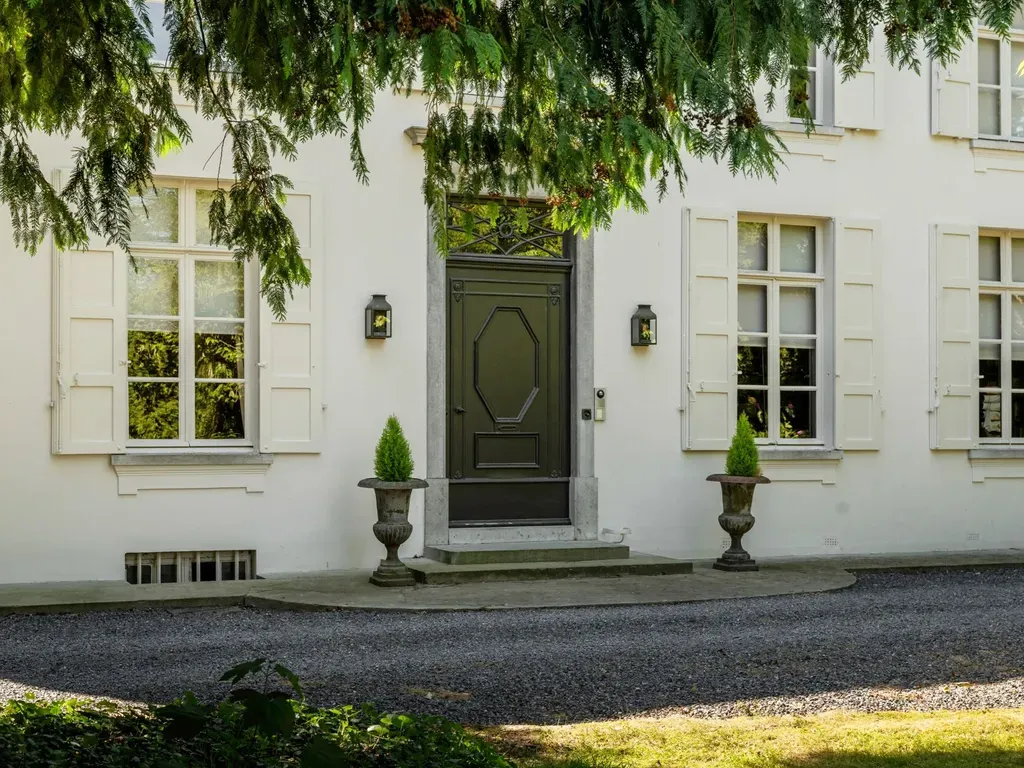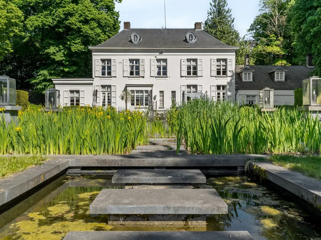 Deze 19de eeuwse herenwoning is bereikbaar via een brede oprijlaan. De voortuin bestaat uit een natuurlijk bos waardoor de woning afgesloten ligt van de straatkant. Links en rechts van het pand zijn 2 carports voorzien waar ruim plaats is voor 6 wagens. De achterliggende tuin met prachtige zwemvijver is Frans geïnspireerd en bestaat uit grote grasvelden, strakke hagen en rechte paadjes.