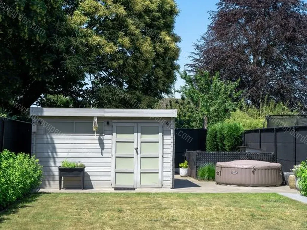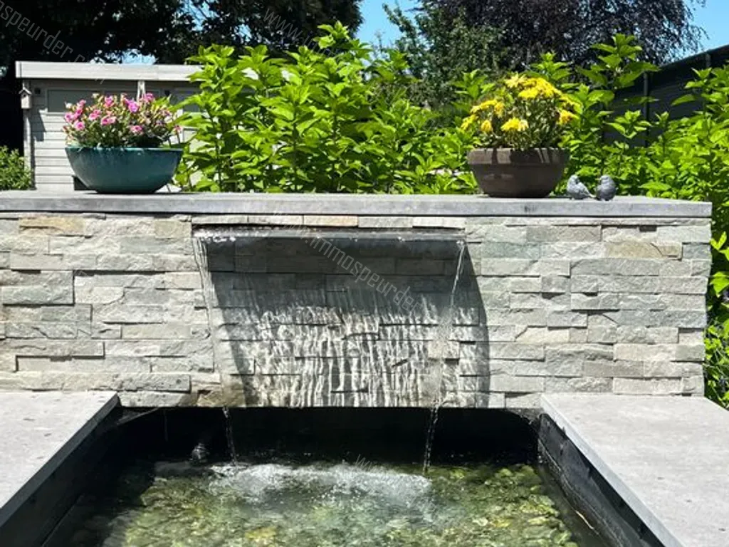 Buiten is er vooraan een autostaanplaats, achteraan werd de tuin volledig aangelegd met een groot terras waterpartij met vijver en fontein en ruim tuinhuis.