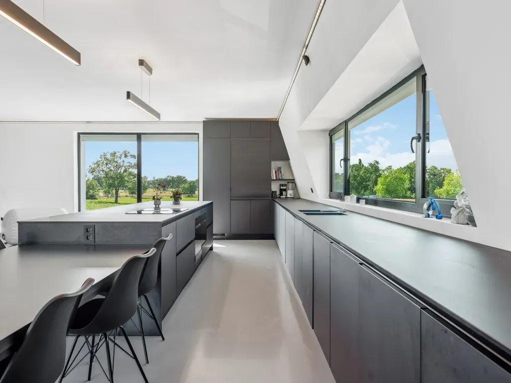 De ruime en lichtrijke leefruimte in loft-stijl en de open keuken met kookeiland vormen het hart van de woning, ideaal voor familie en gasten.