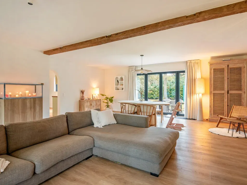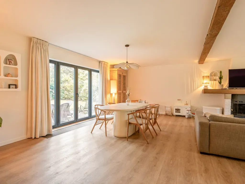 De inkomhal geeft toegang tot een lichtrijke leefruimte met open haard, eiken balken en grote raampartijen die uitgeven op de tuin. De eetkamer sluit naadloos aan en vormt samen met de woonkamer een aangename leefzone met zicht op het groen.