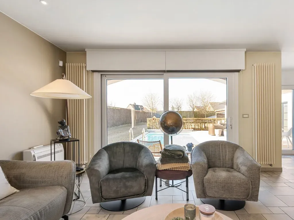 Bij het betreden van de woning kom je binnen in een ruime inkomhal die toegang geeft tot het gastentoilet, de keuken met eetplaats, de lichtrijke en ruime living, en de voormalige dokterspraktijk. De keuken en living vormen één mooi geheel en bieden beide directe toegang tot het zonnige terras met aangenaam uitzicht op het privézwembad. Aansluitend aan de keuken is er een grote bergruimte met veel opbergmogelijkheden.