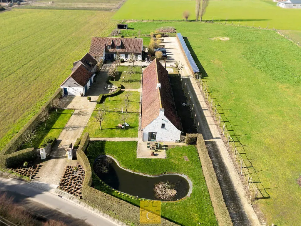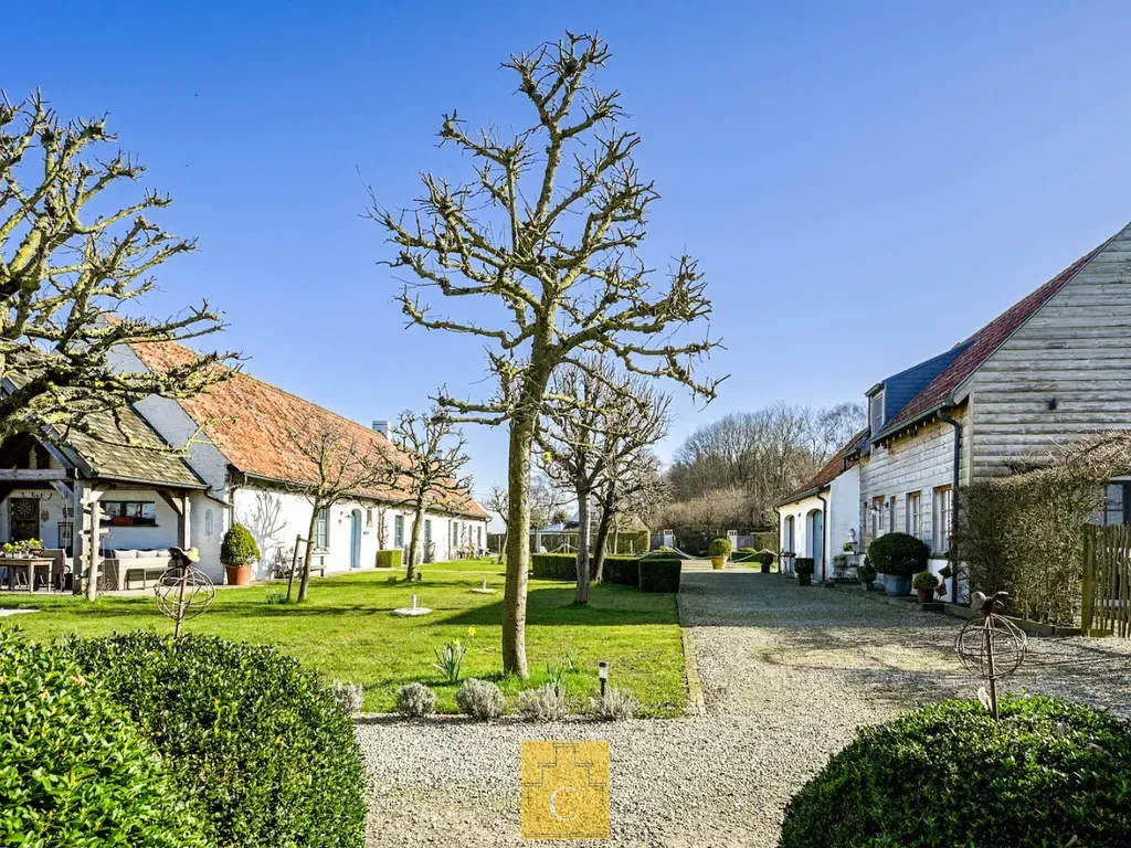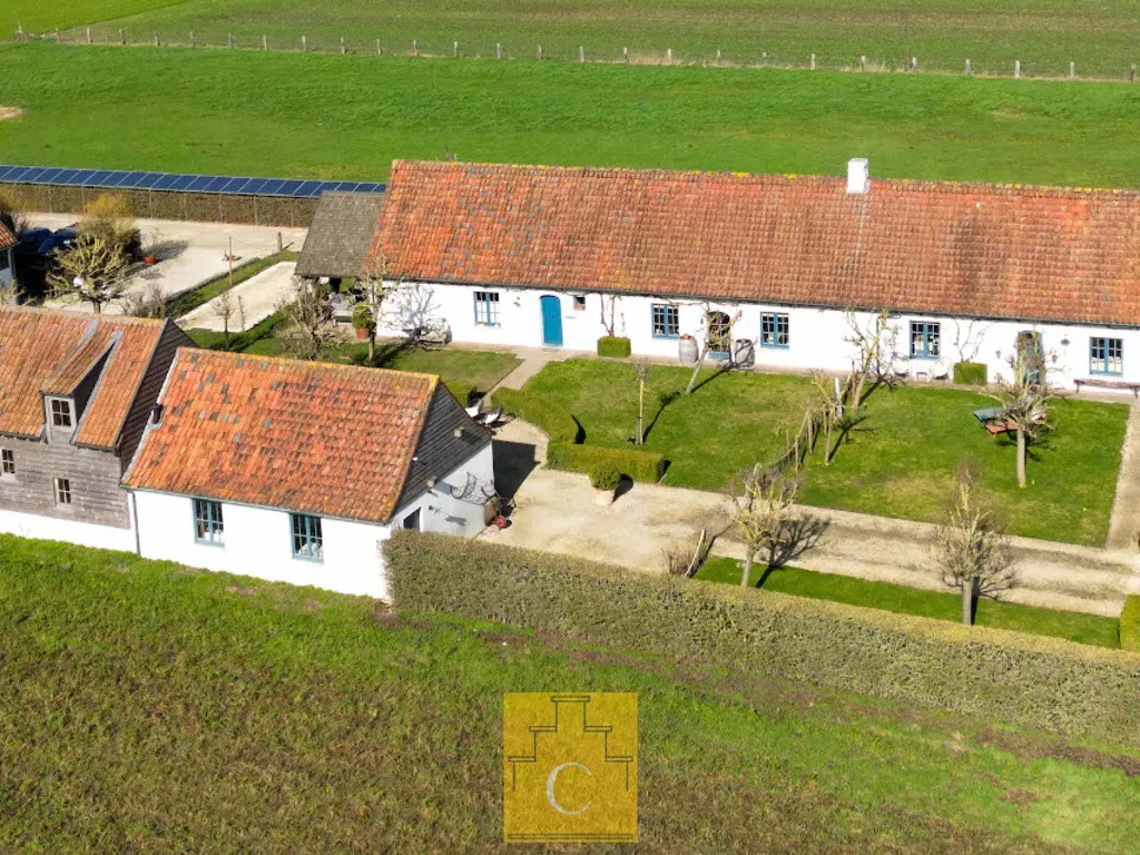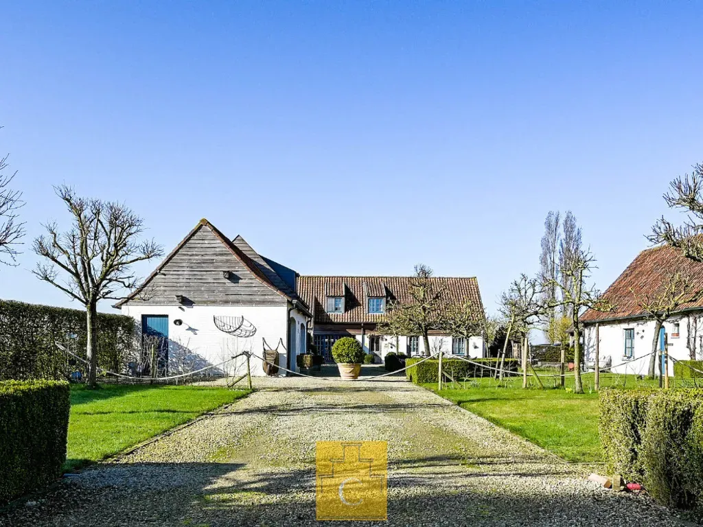Smisseweg 23 - 8755 Ruiselede - In het landelijke Doomkerke, een deelgemeente van Ruiselede-Wingene, in het brede hinterland tussen Brugge en Gent, vinden we deze voormalige hoeve met bijgebouwen, groot erf, dito parking en weiland, dit alles op een oppervlakte van 10.518 m2. De hoeve met zijn verankerde, wit beschilderde bakstenen gevels onder een zadeldak in Vlaamse pannen is opgenomen in de inventaris van het bouwkundig erfgoed en was reeds aangeduid op de Ferraris-kaart (1770-1778). Een schilderachtige locatie in landschappelijk waardevol agrarisch gebied. Het woongedeelte met zijn royale leefruimte open tot in de hoge nok van het dak werd in 1996 met heel veel spirit en een open blik verbouwd (met vergunning). Met 4 bijkomende stedenbouwkundige vergunningen tussen 2005 en 2018 werden de bijgebouwen verbouwd tot een vakantieverblijf met 6 luxe gastenkamers (15 slaapplaatsen/4* classificatie) en een welness. Het vakantieverblijf is tevens erkend als vakantiewoning (5* classificatie). Indeling : De woning werd in 1996 volledig verbouwd. Sindsdien zijn geen ingrijpende wijzigingen meer gebeurd. Het pand is heel origineel qua architectuur met behoud van de authentieke elementen. Het omvat op het gelijkvloers een inkom, toilet, ruime keuken met kleine leefplaats in het verlengde, grote berging met cv ketel mazout, kleine provisieberging met toegang tot kelder, een WOW living met brede schouw, grotendeels open tot in de nok van het dak (roostering werd verwijderd, een passerelle in glas verbindt de slaapkamers op het verdiep). Op het verdiep een grote slaapkamer op de topgevel met lavabo, een voorkamer (bevloering gedeeltelijk in glas) aansluitend bij de 1ste slaapkamer, een grote slaapkamer aan de andere kant van de woning (deze kamer en de voorkamer zijn verbonden door de glazen passerelle) met douche-, bad- en dressingkamer. Garage voor 2 wagens. Ze heeft energielabel D (306 kWh/m2 jaar). Vakantieverblijf (B & B of vakantiewoning) : Op het gelijkvloers een inkom met trap, een overloop naar het welnessgedeelte, een grote gemeenschappelijke gastenruimte met zit- en ontbijthoek en ingerichte keuken, 2 toiletten, klein bureau, een sauna met aansluitend een rustruimte met douche, uitgevend op het terras/ligweide met jacuzzi. Verder op het gelijkvloers gastenkamer 1 met volledige badkamer.