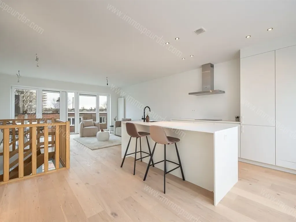 Via de open, houten trap ga je naar de derde en bovenste verdieping, waar je de prachtige leefruimte binnenstapt: een plek van maar liefst 38 m², met een open leefkeuken, plaats voor een groot salon én een eethoek. Het licht valt hier royaal binnen, zowel vooraan, door de grote hoge ramen, als achteraan, door het kamerbrede schuifraam, met zicht op het heerlijke dakterras.