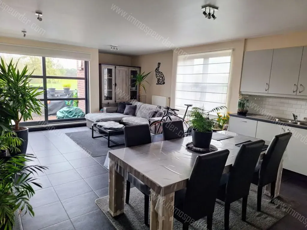 De grote leefruimte baadt in het natuurlijke licht dankzij de twee grote ramen, waardoor een aangename en lichte sfeer wordt gecreëerd.