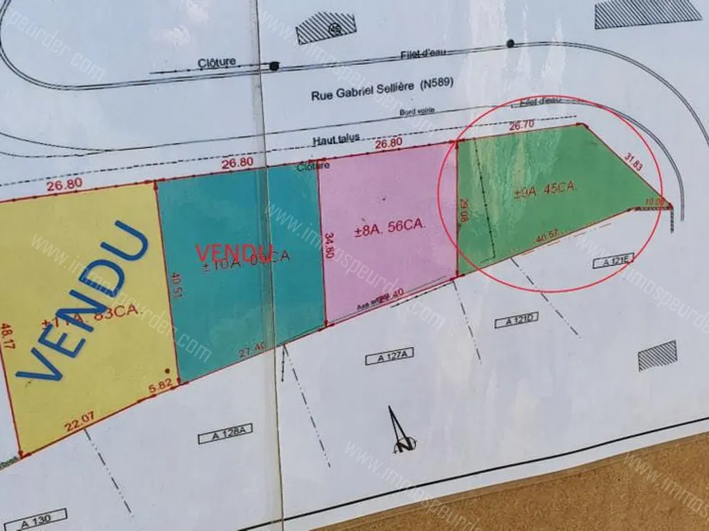 Rue Gabriel Sellière - 6463 Lompret - LOMPRET: Beau terrain à bâtir boisé d'une superficie de 931m² avec d'un côté 26,7m de façade et de l'autre côté 31,83m de façade exposé plein sud dans un des plus beaux villages de Wallonie à 5 minutes du centre de Chimay et des commodités. FAIRE OFFRE A PARTIR DE 46.000 EUROS. Sous réserve de l'acceptation des propriétaires.