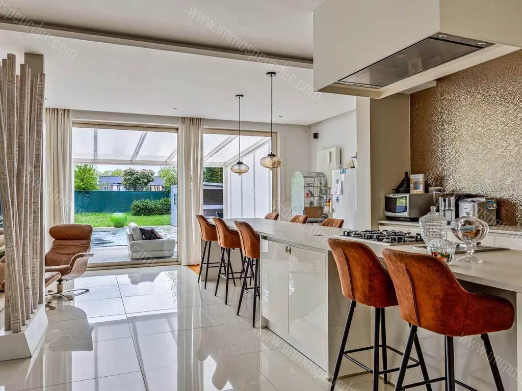 De riante leefruimte, met in elkaar vloeiende zithoek, eethoek en veranda, biedt een prachtig uitzicht op de groene tuin. Aangrenzend aan de eetkamer bevindt zich de volledig geïnstalleerde keuken met kookeiland. Vanuit de keuken heeft u tevens toegang tot de wasplaats, waar u de aansluitingen van het wasmachine en de droogkast kan terugvinden.