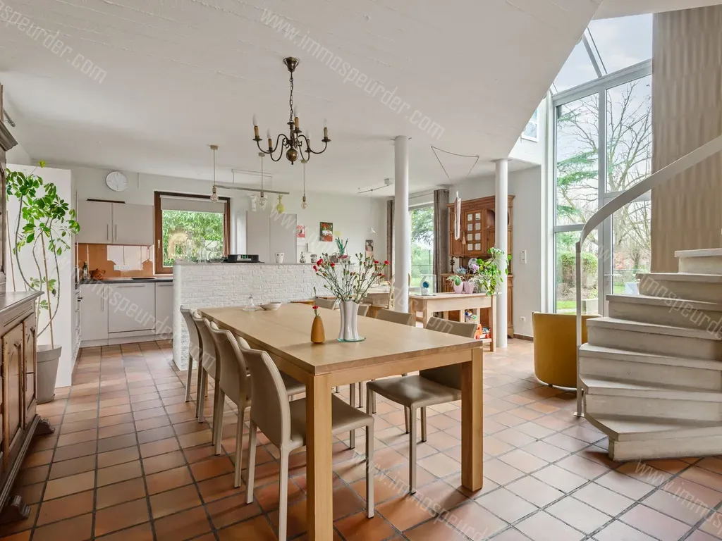 De verbindingsruimte brengt ons naar de uitgestrekte leef- en eetruimte, waar de grote raampartijen en vooral de ruimtelijke vide een gevoel van luchtigheid en openheid creëren. Deze ruimte staat in verbinding met de volledig uitgeruste, open keuken dewelke directe toegang biedt tot de prachtig onderhouden tuin.