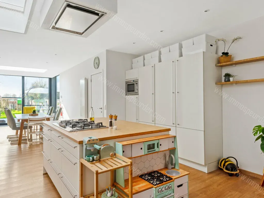 Centraal bevinden zich de open ingerichte keuken met kookeiland & toestellen, de trap naar de 1ste verdieping en een apart toilet.