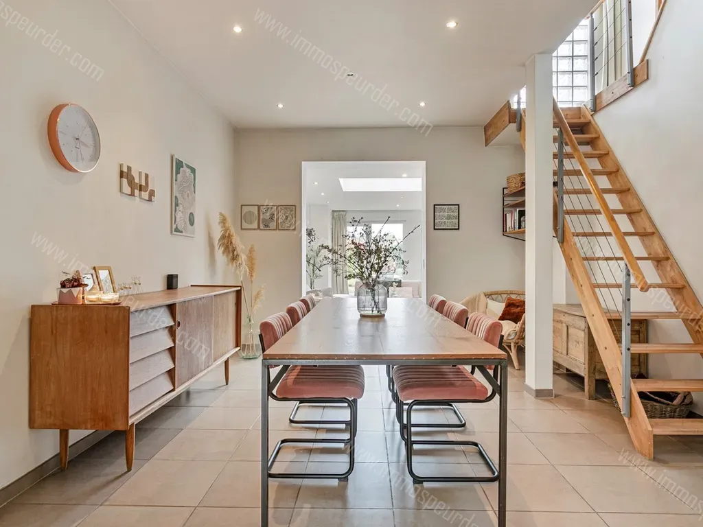 Gelijkvloers: inkomhal, toilet, moderne keuken (keramische kookplaat, koelkast, oven, vaatwasser,...), eetkamer en woonkamer met lichtkoepel en zicht op de tuin.