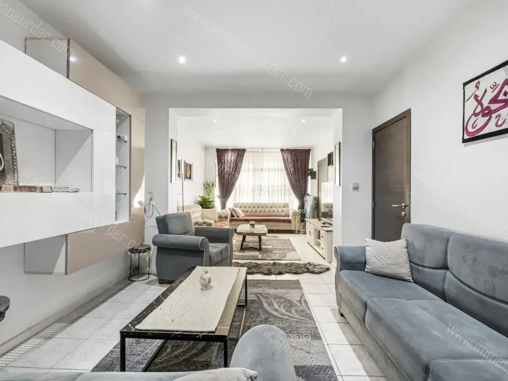 Via de draaideur betreden we de woonkamer die is afgewerkt met een hoogwaardige keramische tegel.